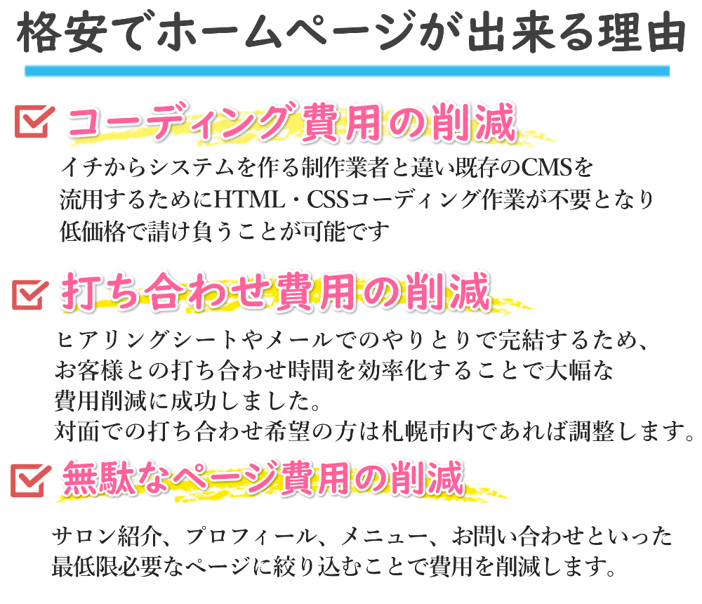 そこでWEBサイト作成12年の経験がある私が制作会社に代わって割安で制作いたします。
